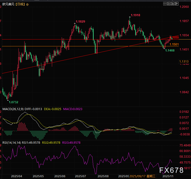 汇通财经APP讯——周一(11月17日)欧元兑美元展开第二日回调,本周开盘后延续下行态势,一度震荡测试1.1600下方支撑位,目前成功收复早晨跌幅,,主要受市场谨慎情绪、美联储宽松预期退潮及地缘摩擦升温等多重因素叠加影响。当前市场目光高度集中于延迟发布的美国宏观经济数据,同时欧洲央行的政策表态与欧元区经济基本面分化,也为欧元走势增添了不确定性。