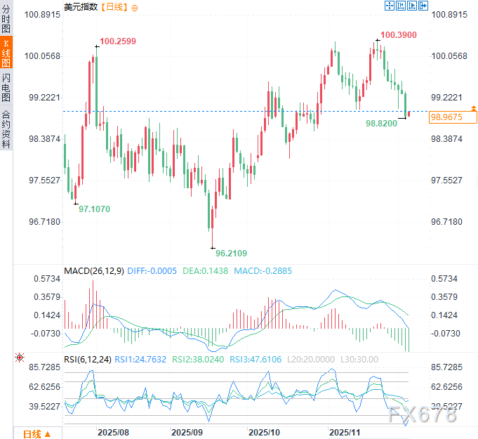 特朗普政府现行的关税及配套财政方案,主要通过加剧通胀、扩大债务、抑制增长和增加政策不确定性这几条渠道,对美元构成了潜在的下行压力。周四美元指数于98.95附近窄幅震荡,此前曾连续七个交易日走低,前一交易日一度触及近五周低点98.82。